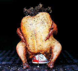 In Georgia gibt’s Soul Food aus der Schwarzenküche, und es wird gegrillt wie der Teufel, auch im Hähnchenbereich – erschrecken Sie nicht auf S. 291, wenn ein nacktes Huhn im Backofen auf einer halb geleerten Bierdose sitzt. So ist das da, wenn das Tier aufrecht braten soll, weil keiner Lust hat, den Vogel dauernd umzudrehen (und die Kochmonster haben das natürlich sofort nachgekocht). Aber die Würzpaste, ein Mix aus Fenchel- und Kreuzkümmelsamen, Paprika- und Chilipulver und Rohrzucker zeigt, dass Amerikaner natürlich aromatisieren können.