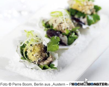Austern im Sesammantel mit marinierten Austernpilzen und Kräutern