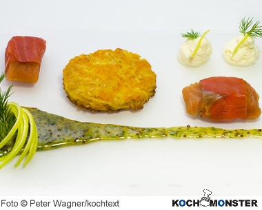 Graved Lachs mit Bataten-Selleriepuffer und Apfel-Kren-Espuma