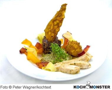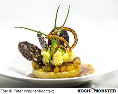 Der hochprämierte fränkische Spitzenkoch Tobias Dittrich kombiniert zunächst klassisch Gänseleber mit der Süße von Äpfeln, setzt aber mit dem lakritzigen Geschmack des Langpfeffers und der Stärkesüße einer mit Portwein abgschmeckten Mais...[mehr...]
