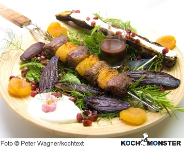 Lamm-Aprikosen-Spießchen mit Minzjoghurt, Granatapfel und Karamellschalotten