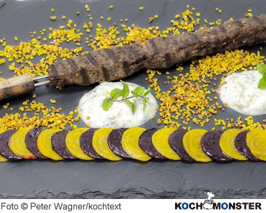 Der Bad Hersfelder Einsterner Patrick Spies nutzt für diese raffinierte Komposition gleich mehrere Zutaten rings um Ziegen und ihre jungen Nachkommen, darunter der sonst nur sehr selten gesehene Zickleinbauch, den er mit etwas Tandoori minimal in...[mehr...]