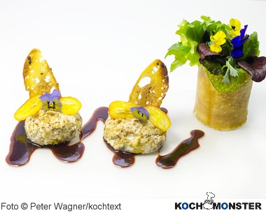 Diese Vorspeise kombiniert wild Aromen und Texturen: Die Säure der Kumquatscreme im Bauch der Ziegenklöße nimmt dem Fett des Käses den letzten Hauch Schmierigkeit, umgekehrt harmoniert dessen rasser Grundton schön mit den orangig-süßen Ante...[mehr...]
