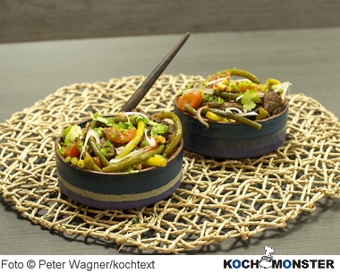 Bei diesem gehaltvollen Salat treffen sich asiatische und mediterrane Aromen, wobei die italienische Peperoni für eine noch gut auszuhaltende Schärfe sorgt.