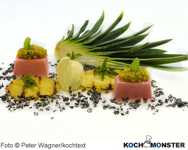 Passionsfrucht-Brûlée mit gegrilltem Ananastatar