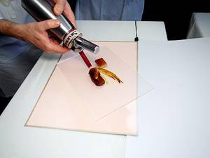Beim Anrichten sollte der Sellerieschaum eine Temperatur von 55-60 °C haben, da dies das beste Schaumergebnis gibt. Schaum anspritzen,