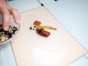 Dem Bader Badener Sternekoch Paul Stradner kombiniert mit diesem Gericht für sein Brenners Park Restaurant die Zubereitungsmethoden der Highend-Küche (Sous Vide-Langzeitgaren, Pacojet, Thermomix) mit fast schon derber Aromatik und Textur von aufgepoppten Schweineschwarten und angekrosster Blutwurst. Die hellen, frischen Noten von Sellerie als Würfel und als Espuma sorgen für eine schöne Balance zu den schweren Schweinereien.