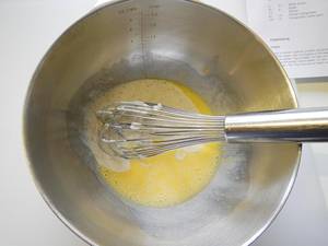 Eiweiß mit Feinsieb abseihen, Butter leicht abkühlen lassen. Eier und Eigelbe in Schüssel aufrühren.