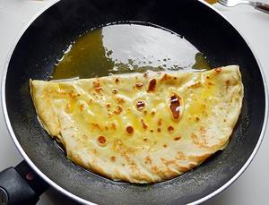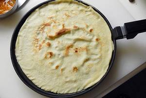 Wer eine sehr große Pfanne (32 cm) hat, kann auch vier Crêpes auf einmal zubereiten.