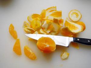 Restliche Schale entfernen und aus der Frucht Segmente ohne die Zwischenhäutchen heraus schneiden.