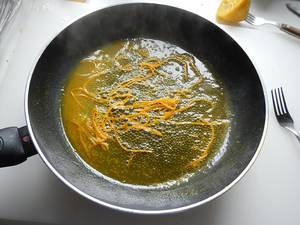 Mit einem Viertel des Orangensaftes aufgießen, ein Viertel der Zesten zugeben und 2 Min. dünsten.