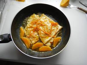Das vielleicht beste Gericht aus den beiden Welten "Pfannkuchen" und "Service am Tisch" sind die im Restaurant oft spektakulär direkt vor den Augen des Gastes flambierten Crêpe Suzette. Diese karamellisierten Orangen-Omeletten wurden erstmals Ende des 19. Jahrhunderts dokumentiert, um ihren Namen ranken sich diverse Entstehungsgeschichten. Die wahrscheinlichste erzählt vom britischen König Edward VII., der (damals noch Kronprinz) 1896 im Restaurant „Café de Paris“ in Monte Carlo gemeinsam mit einer Konkubine, der Näherin Suzette, dinierte. Der junge Kochlehrling Henri Charpentier war bei der Zubereitung des Crêpe-Nachtisches so nervös, dass er ein Fläschchen hochprozentigen Orangenlikör umstieß, der in der Crêpe-Pfanne Feuer fing.