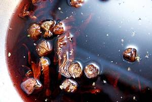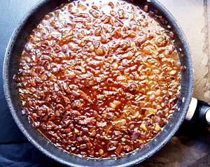 Eingeweichte Tomaten samt Einweichflüssigkeit dazu geben, komplett einkochen lassen. Restlichen Rotwein, Fond, Kümmel(im Mörser fein zerstoßen!), Salz, Pfeffer, Chiliflocken, Paprikapulver und die Hälfte des Majorans einrühren, aufkochen lassen.