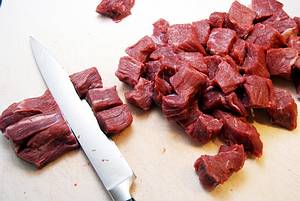 Große, sichtbare Fettstücke abschneiden (evtl. zu Rinderschmalz auslassen). Restliches Fett, Sehnen und Bindegewebe nicht entfernen. Fleisch in Längsrichtung (mit der Faser) in ca. 3 cm dicke, möglichst gleichförmige Scheiben schneiden.