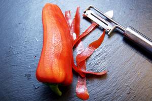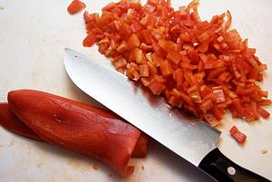 Spitzpaprika schälen und in kleine Würfel schneiden.