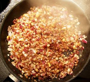 Pfanne auswischen, Olivenöl nicht zu stark erhitzen, Zwiebeln und Knoblauch darin mit dem Zucker leicht karamellisieren.