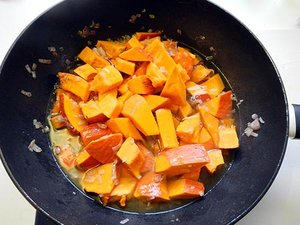 Orange schälen und in kleine Würfel schneiden, Saft auffangen. Am Ende der Kochzeit Fruchtfleisch und Saft zum Kürbis geben, Sahne einrühren.