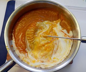 Masse in starkem Mixer so glatt wie möglich mixen, in den Topf zurück schütten. Durch vorsichtiges Einkochen oder weitere Zugabe von Sahne auf die gewünschte Konsistenz bringen, Orange-Bitter einrühren. Mit Pfeffer und Salz abschmecken.