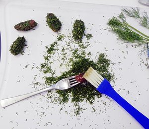 Dillspitzen abzupfen und fein hacken. Datteln mit Pinsel mit dem Honig bestreichen, mit dem Dill ringsherum dick panieren.