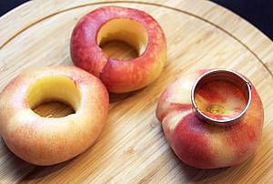 Jeden Pfirsich quer in 4 Ringe schneiden.