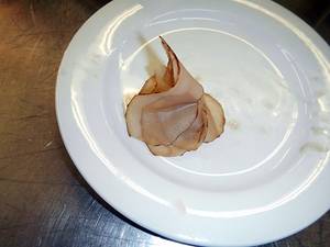 Zunächst mittels eines Löffels das Topinamburpüree über die Löffelspitze auf einen vorgewärmten Teller im rechten Winkel ziehen. Die gebratenen Klettenwurzeln jeweils stehend und liegend entlang dieses Winkels anrichten.
