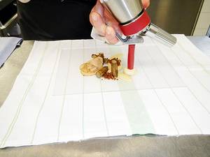 Diese Masse in eine ISI-Flasche füllen und nacheinander 2 Gaspatronen aufziehen; nach jeder Patrone die Flasche gut durchschütteln. Den Schaum in der Flasche in einem Wasserbad oder Ofen bei ca 65 °C warmhalten.
