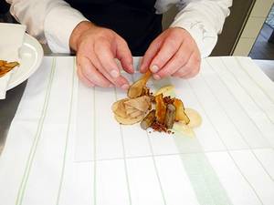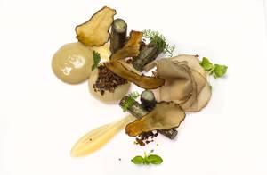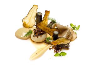 Jens Rittmeyer, Einsterner im Restaurant Kai3 im feinen Hotel Budersand in Hörnum auf Sylt, über sein veganes Zwischengericht: "Beim Waldspaziergang entstand dieses Gericht; die Klettenwurzeln wirken ja wie Baumstämme und zusammen mit dem Crunch un den Kräutern sieht das schon ein klein wenig wie auf einer Waldeslichtung aus. Der Pilzsud passt bei diesem Thema ganz hervorragend dazu."