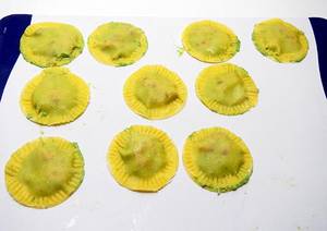 Teig portionsweise mit Nudelmaschine nach und nach zu dünnen Bahnen (zweitdünnste Einstellung) walzen (alternativ mit Nudelholz plattieren), mit 5-cm-Ring Kreise ausstechen,