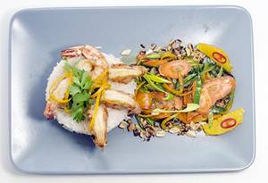 Reis mit vier Dessertringen oder Timbal-Förmchen in die Mitte von gut vorgeheizten großen Tellern anrichten. Garnelen kreisförmig auf dem Reis verteilen, Bratflüssigkeit der Garnelen auf die vier Reis-Zylinder verteilen. WOK-Gemüse aufteilen, mit Korianderzweigchen garnieren und sofort servieren.
