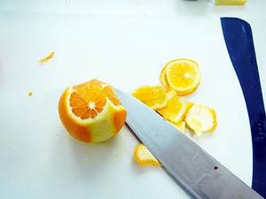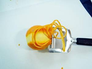 Orange waschen, abtrocknen. Von 1 Orange mit Zestenreißer die Haut in Streifen abziehen.