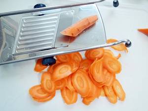 Karotten schälen, diagonal anschneiden und auf Hobel in hauchdünne diagonale Scheiben hobeln.