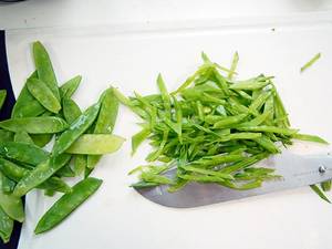 Zuckerschoten waschen, Enden entfernen und in schmale Diagonalstreifen schneiden.