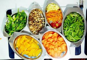 Jetzt den Orangensaft und die Orangenfilets zugeben, 20 Sekunden weiterkochen, dann den WOK vom Herd ziehen und mit den vier Saucen nach Belieben abschmecken. Direkt vor dem Anrichten Koriander und Nüsse unterheben.