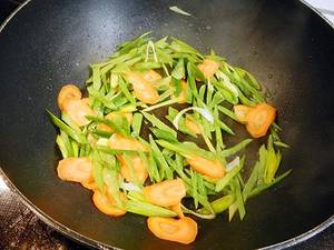 Wenn die Garnelen in der Pfanne ruhen, Erdnussöl im WOK erhitzen und Zutaten in dieser Reihenfolge mit jeweils 20 Sekunden Zwischenrühren in den Topf geben: Zuckerschoten, Ingwer, Chili, Karotten, Lauch.