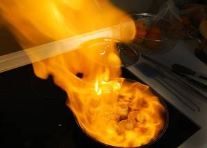 Brennenden Pfanneninhalt mehrfach schütteln. Wenn die Flammen erloschen sind, noch 2 Min. bei voller Hitze dünsten, dann Pfanne vom Herd ziehen und sofort mit der Zubereitung des WOK-Gemüses beginnen.