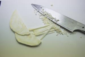 Knoblauchzehen halbieren, evtl. Keim entfernen