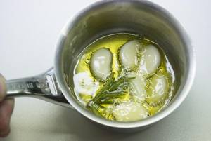 und zusammen mit der Rosmarinspitze und 2 El Öl in sehr kleinem Topf oder Pfanne kurz andünsten, dann im 160 Grad heißen Ofen 10 Min. konfieren.