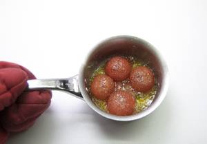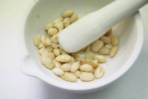 Knoblauch entnehmen, Öl & Töpfchen für die Tomaten aufheben. Knoblauch und Bohnen im Mörser zerquetschen.