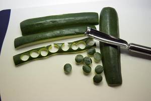 Zucchini waschen, an den Enden abschneiden. Hochkant stellen, längs die kompletten Seiten in 4 Streifen abschneiden. Aus diesen Streifen mit einem Apfelkernausstecher kleine Zylinder ausstechen (Kern und Ausstech-Reste anderweitig verwenden).