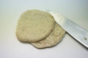 Pitabrot auf einer Aufschnittmaschine oder mit dem Messer in hauchdünne Scheiben schneiden.