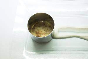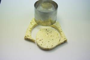 Den Halloumi-Käse in dünne Scheiben schneiden und mit einem 7cm-Anrichtring ausstechen.