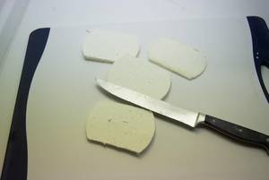 Den Manouri-Käse mit einem dünnklingigen sehr scharfen Messer in vier dünne Scheiben schneiden.
