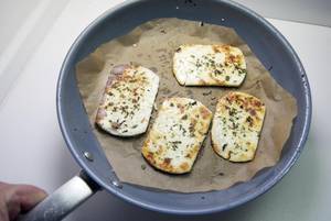Eine große beschichtete Pfanne mit einer Lage passend zugeschnittenem Backpapier auslegen, Papier muss auf der Oberfläche aufliegen. Pfanne auf mittlere Temperatur vorheizen, Manouri-Käse-Scheiben ohne Öl einlegen und auf beiden Seiten goldgelb ausbraten.