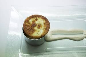 Mit dem 7cm-Ring aus den Pita-Scheiben zwei Taler ausstechen. Ring neben der Creme auf Teller stellen. Zunächst die Pita-Scheibe eindrücken,