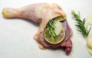 Hühnerkeulen ausführlich unter fließendem Wasser abwaschen und trocknen. Knoblauch schälen und in dünne Scheiben hobeln. Limette unter fließend heißem Wasser abschrubben, trocknen und in Scheiben schneiden (es werden 8 Scheiben benötigt). Rosmarinzweige (junge Zweige mit flexiblem Ast nehmen) in Stücke von je ca. 4 cm zerteilen.