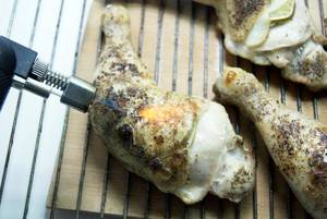 Keulen je 8 Minuten auf beiden Seiten unter den Backofengrill legen (Achtung: dürfen nicht schwarz werden). Anschließend mit Flambierbrenner die Haut nach Belieben krossen.