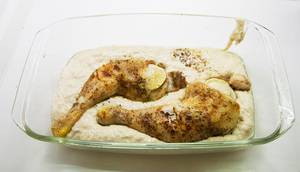 Ein Drittel des Teiges in eine tiefe, große, mit Öl eingestrichene Brotback- oder Auflaufform verteilen. 2 Keulen eindrücken...