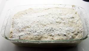 ...mit nächstem Teigdrittel verstreichen, weitere 2 Keulen versetzt in den Teig drücken und mit dem Rest des Teiges bündig bedecken. Etwas Mehl aufsieben.