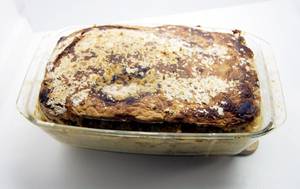 Inzwischen den Backofen (keine Umluft) auf 230 Grad vorheizen. Backform auf das Blech stellen und 1 Tasse Wasser auf das Blech schütten, sofort die Tür schließen und Temperatur auf 180 Grad einstellen. Nach 10 Min. kurz die Tür öffnen und den Dampf entweichen lassen. Bei dieser Temperatur 90 Minuten backen.