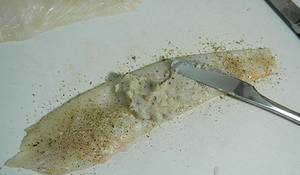 Von den Filets falls nötig die Silberhaut auf der Rückseite abparieren, längs in jeweils zwei Teile schneiden, beidseitig salzen und pfeffern. Einseitig dünn mit der Lardocreme bestreichen.